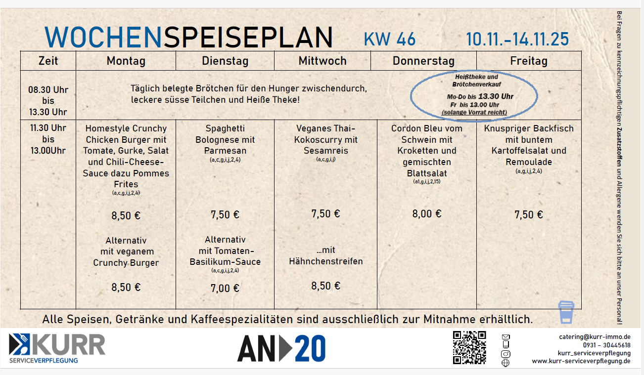 Aktueller Speiseplan AN20 Lounge KW 46->10/11 – 14/11/2025