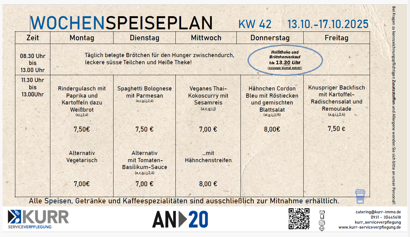 Aktueller Speiseplan AN20 Lounge KW 42->13/10 -17/10/2025