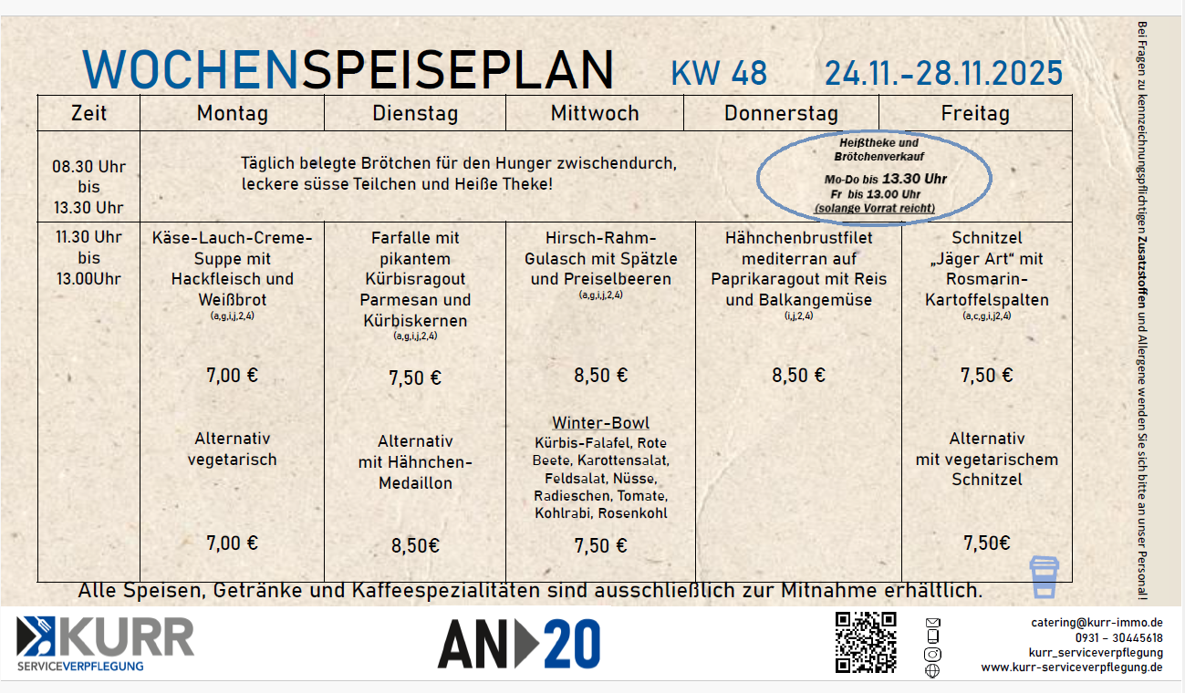 Aktueller Speiseplan AN20 Lounge KW 48->24/11 – 28/11/2025